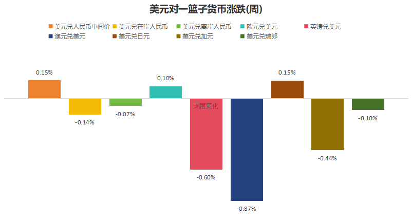 统计数据显示,上周,在岸人民币兑美元累计上涨99个基点报7.1125,离岸人民币兑美元累涨52个基点报7.1194,人民币对美元中间价下跌109个点报7.1128。